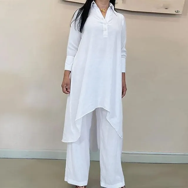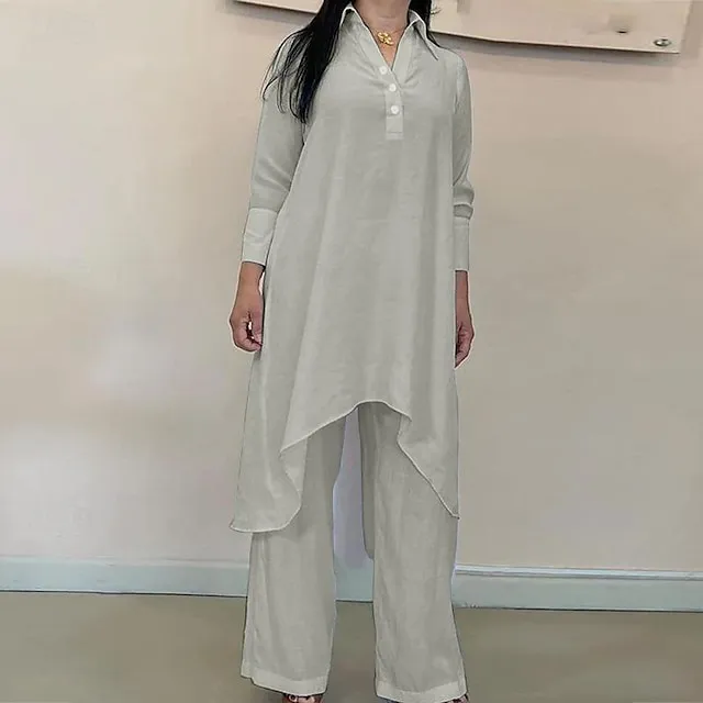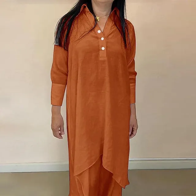 Linen Set Shirt Tunic Shirts Blouse Women’s White Orange Gray Solid Color Button 2 Piece Street Daily Fashion Shirt Collar Cotton Linen Regular Fit S
