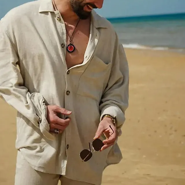 Men’s Linen Shirt Summer Shirt Beach Shirt Khaki Long Sleeve Plain Turndown Spring & Summer Casual Daily Clothing Apparel Front Pocket