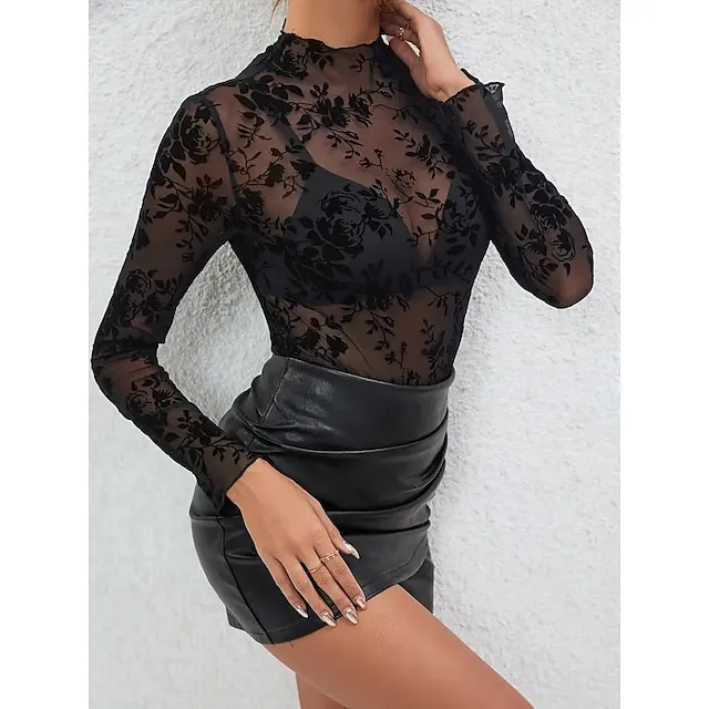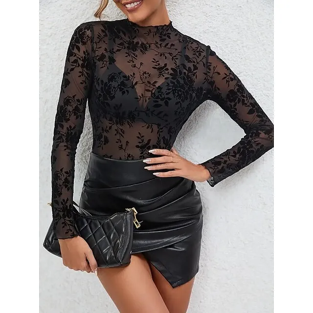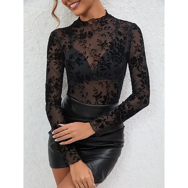 Shirt Blouse Women’s Black Floral Lace Print Casual Holiday Fashion Sexy Round Neck Regular Fit M