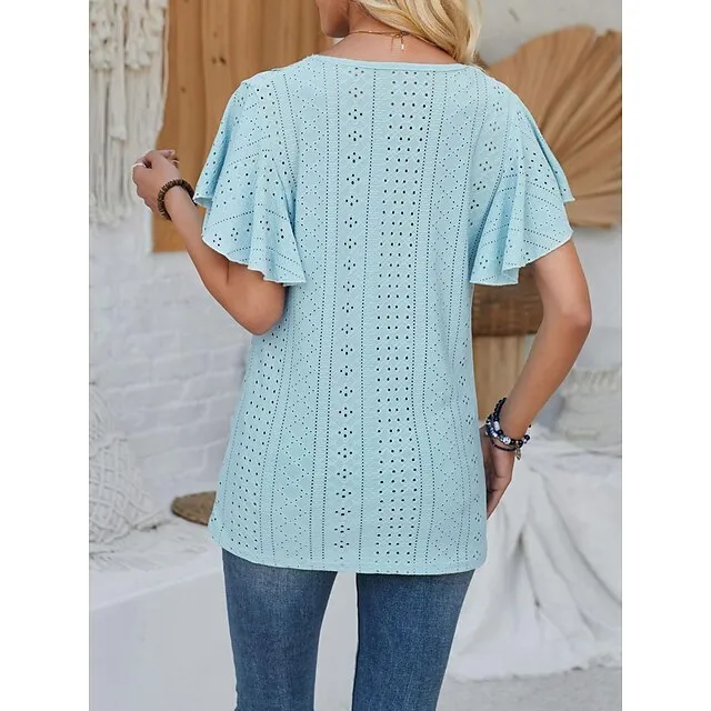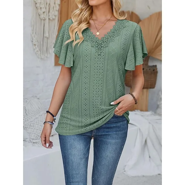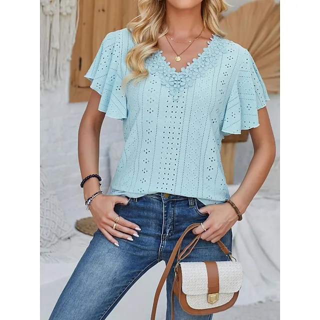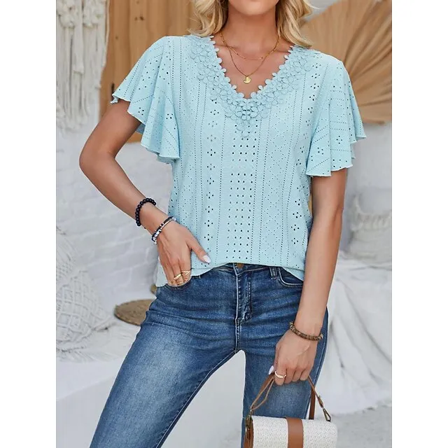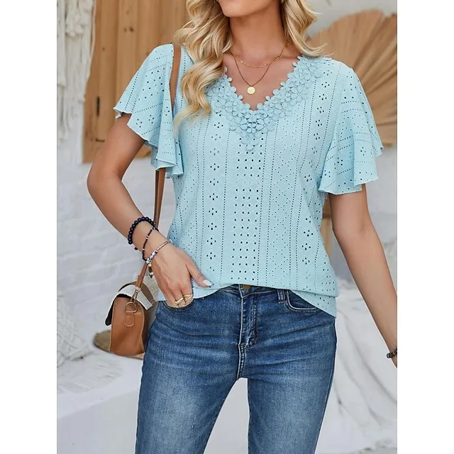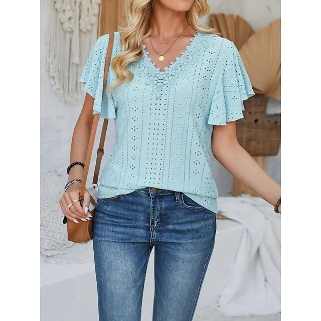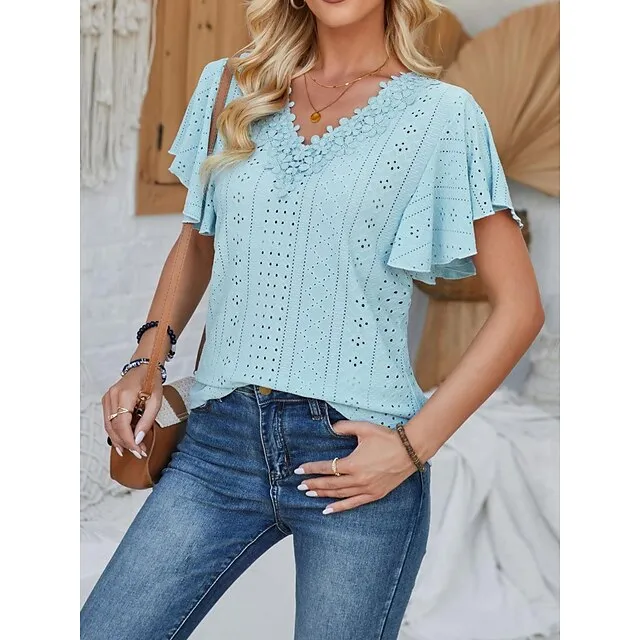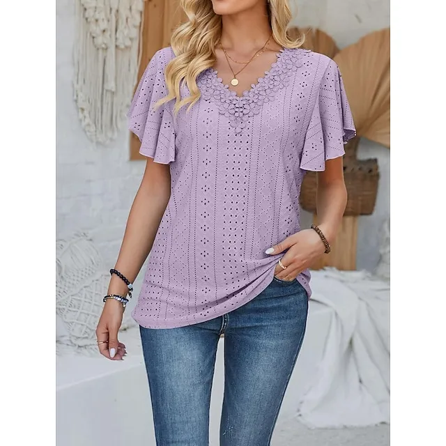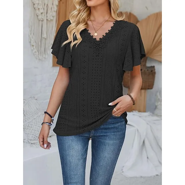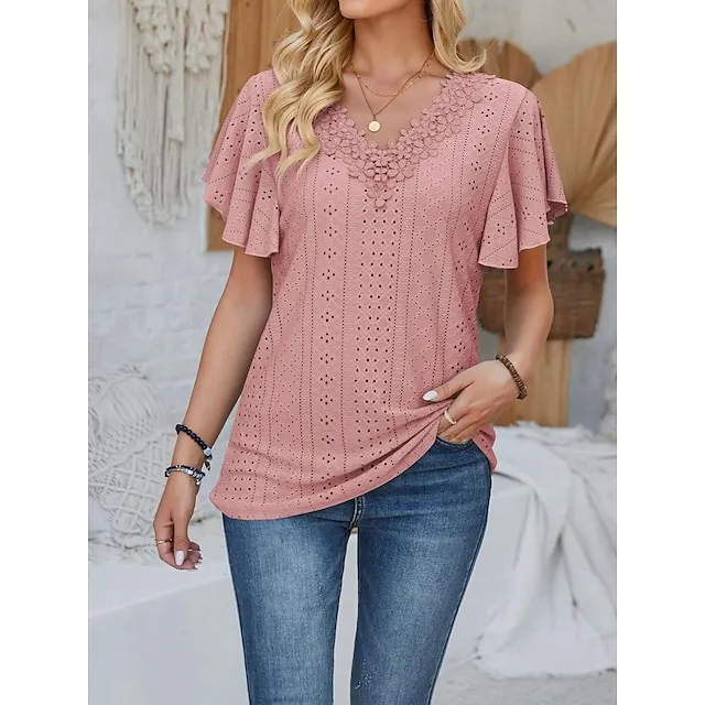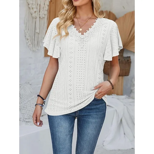 Shirt Blouse Women’s Black White Pink Plain Lace Ruffle Street Daily Fashion V Neck Regular Fit S