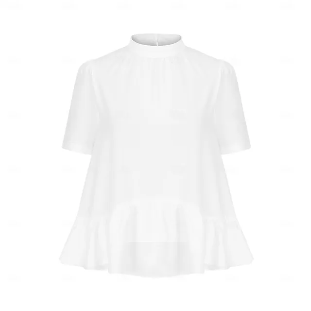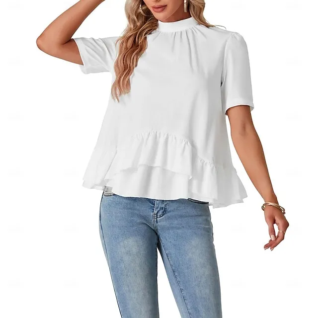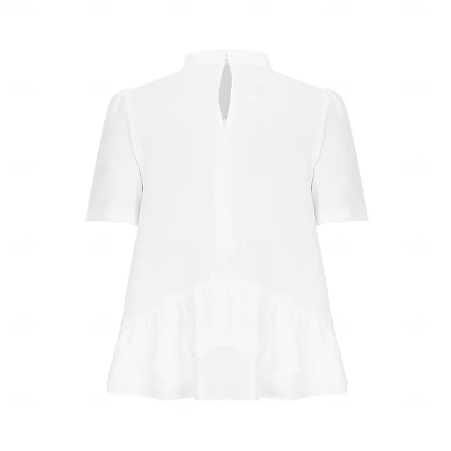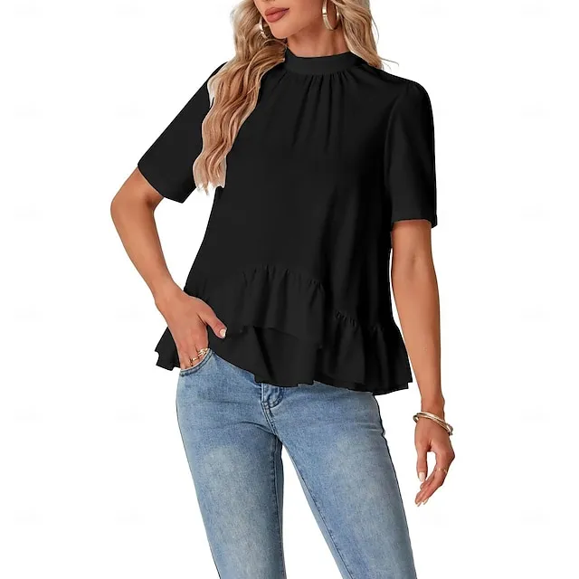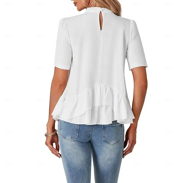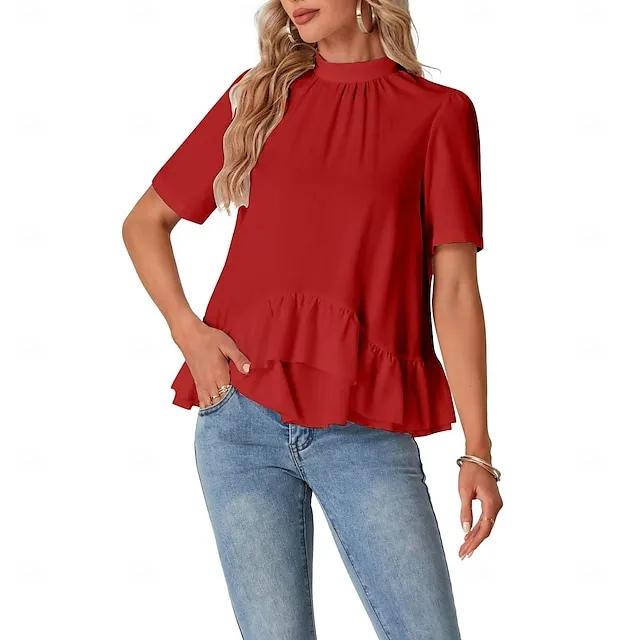 Shirt Blouse Women’s Black White Red Solid Color Ruffle Street Daily Fashion Round Neck S