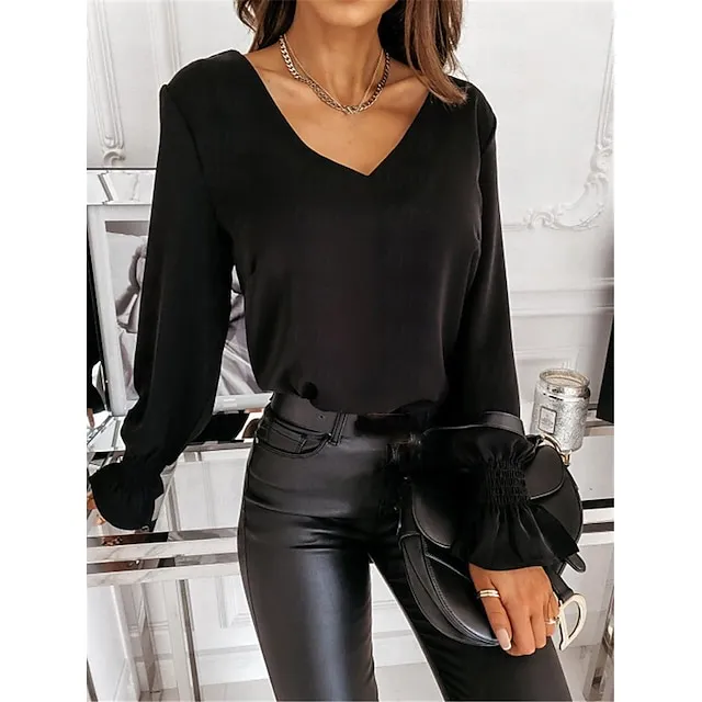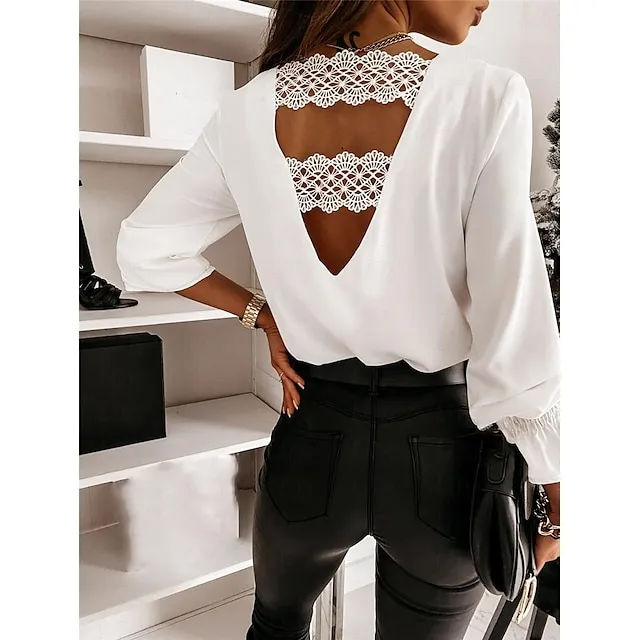 Shirt Blouse Women’s Black White Solid Color Lace Open Back Street Daily Fashion V Neck S