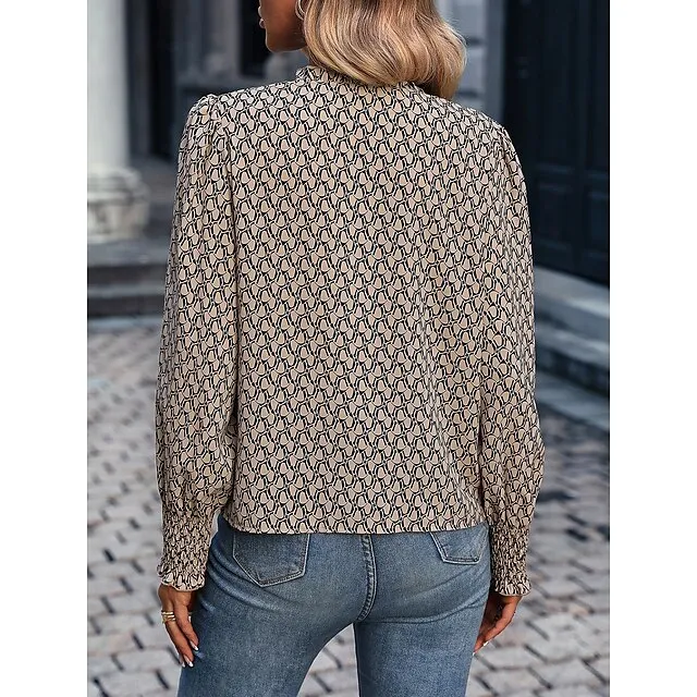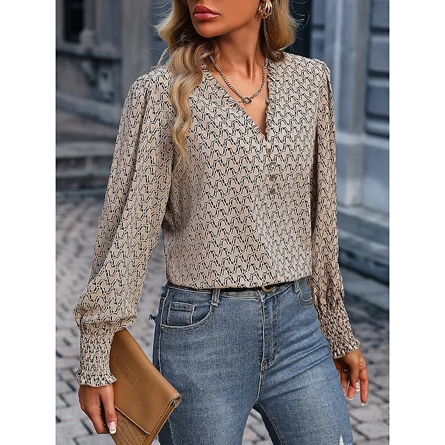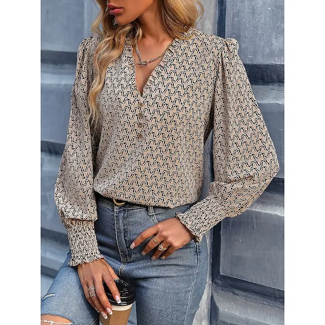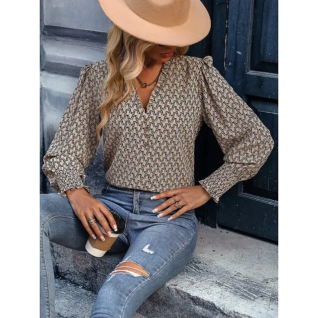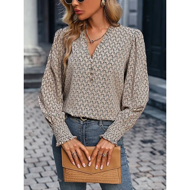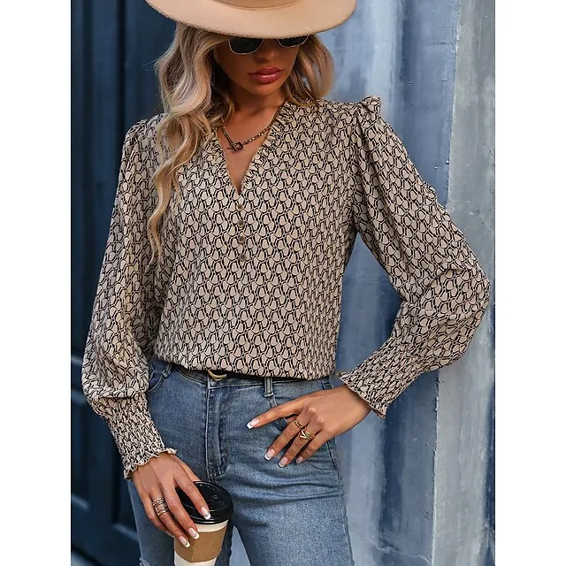 Shirt Blouse Women’s Khaki Graphic Button Print Casual Fashion V Neck Regular Fit S