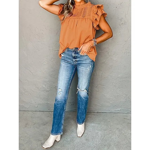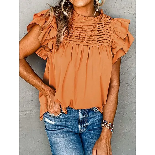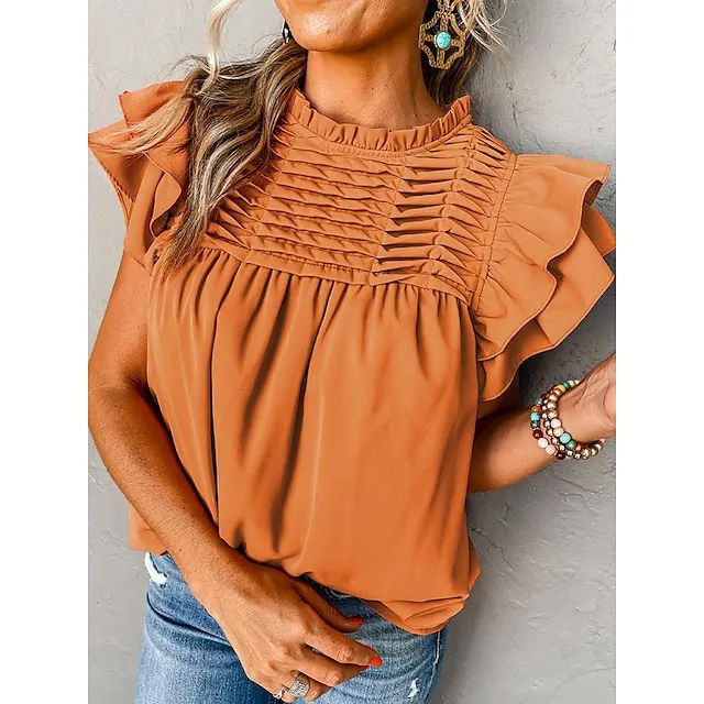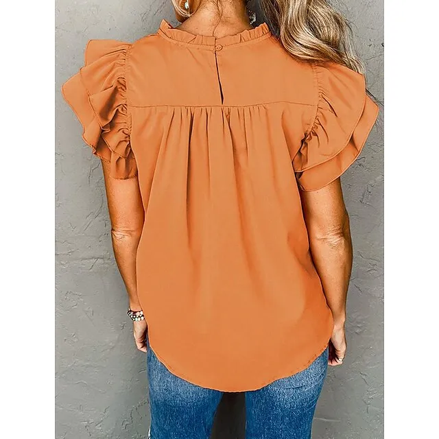 Shirt Blouse Women’s Orange Solid Color Ruched Ruffle Street Daily Fashion Round Neck S
