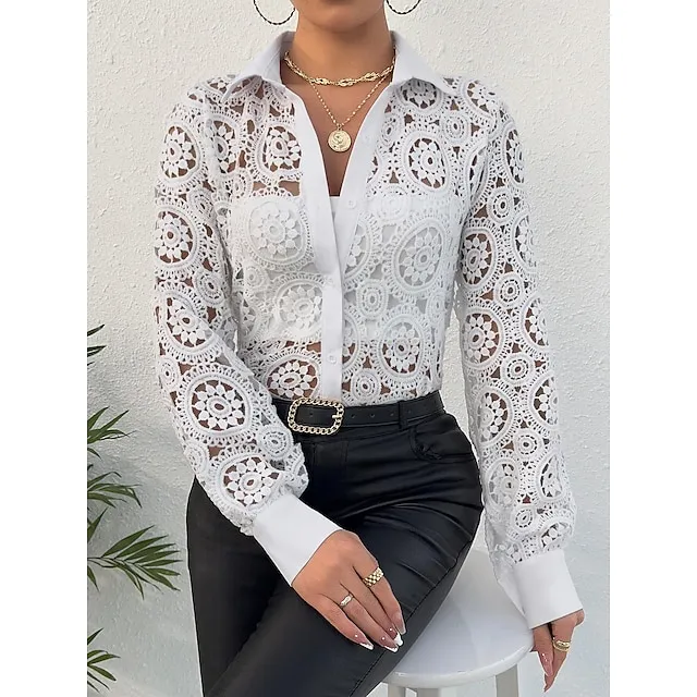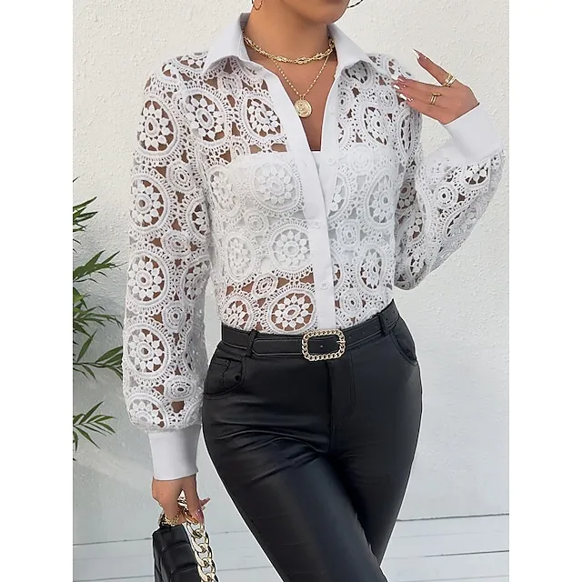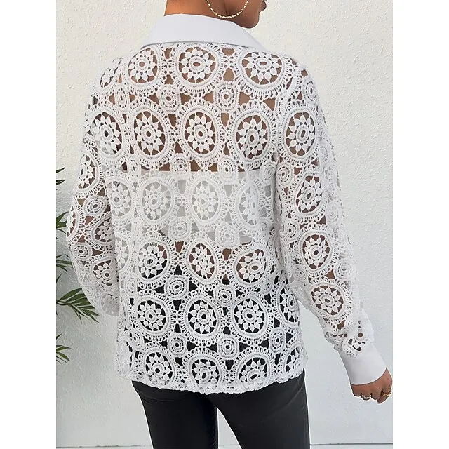 Shirt Blouse Women’s White Plain Lace Button Street Daily Fashion Shirt Collar Regular Fit S