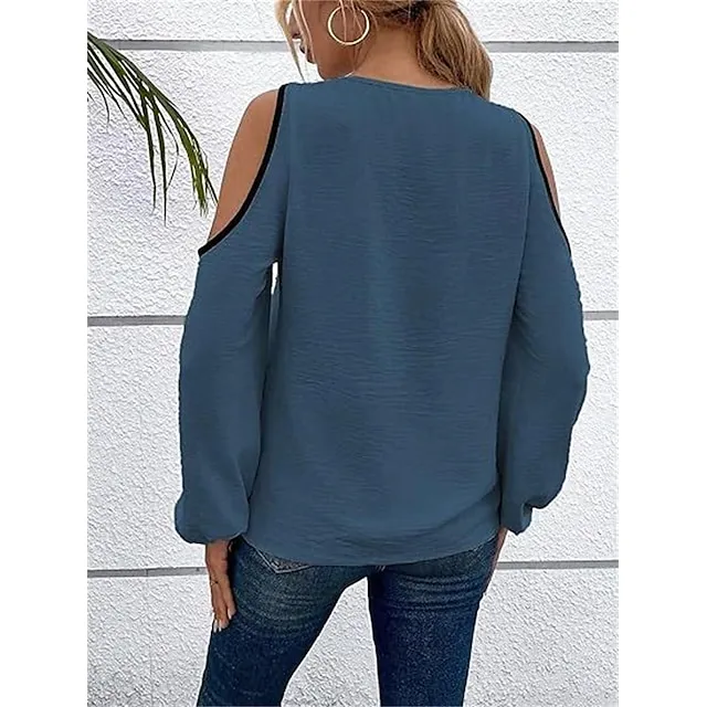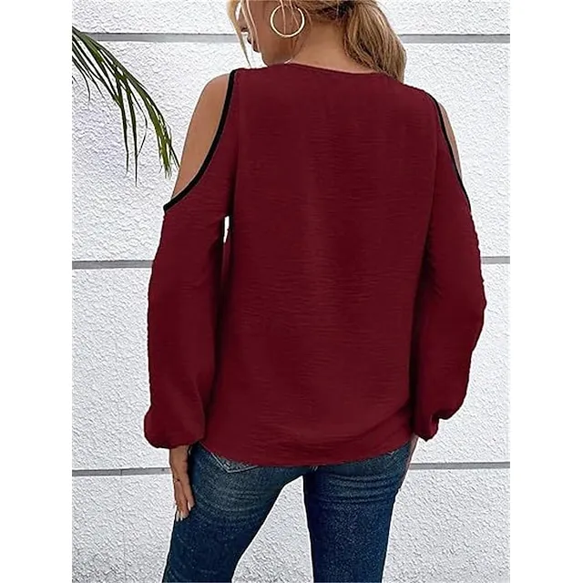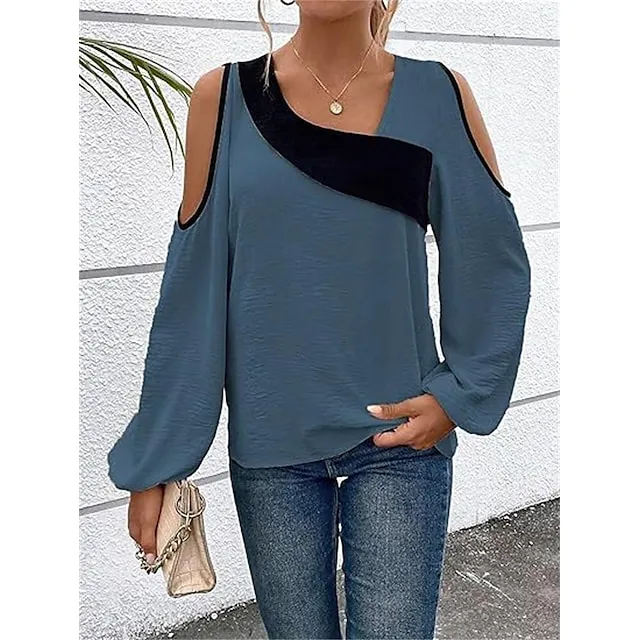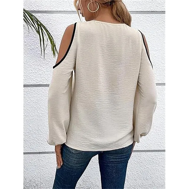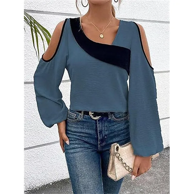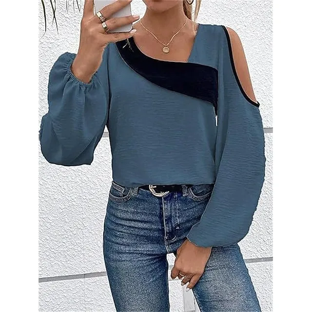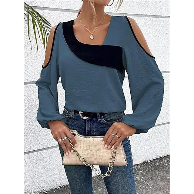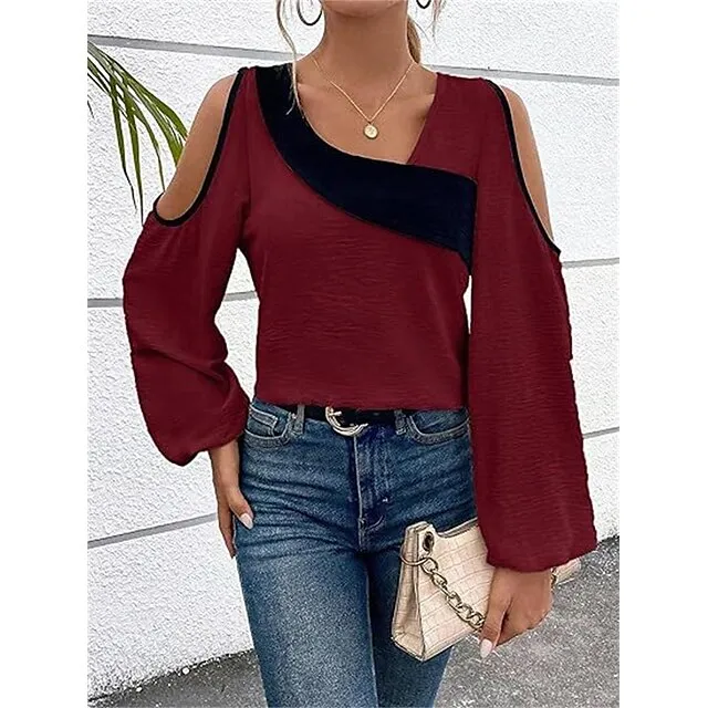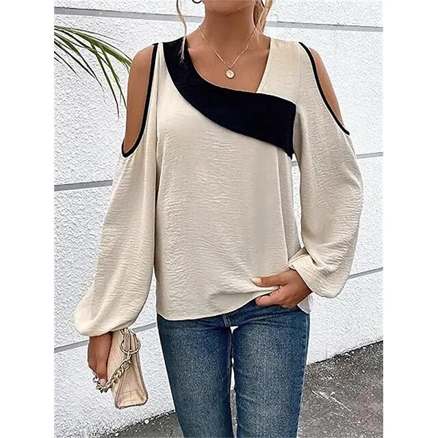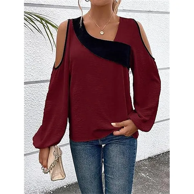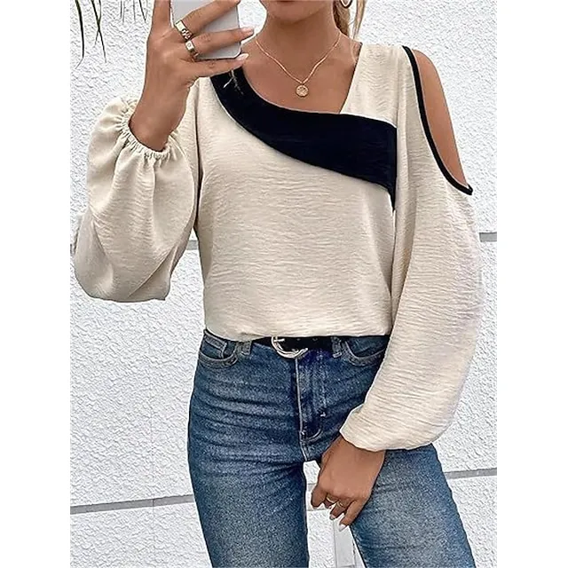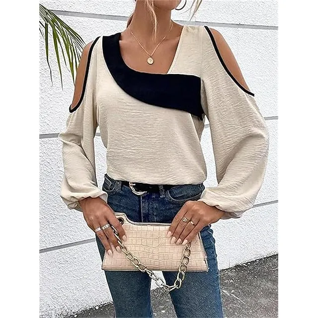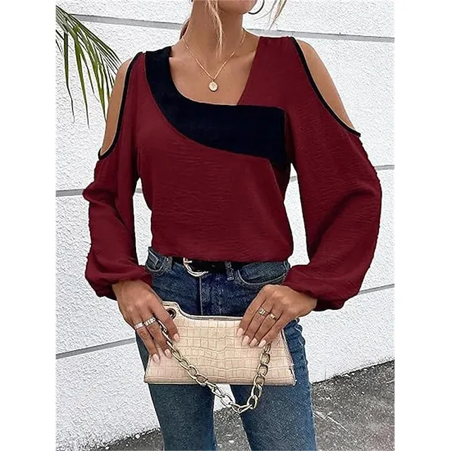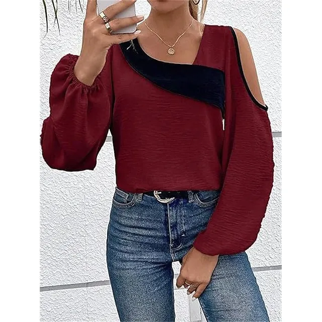 Shirt Blouse Women’s Wine Blue Beige Color Block Cut Out Street Daily Fashion V Neck Regular Fit S