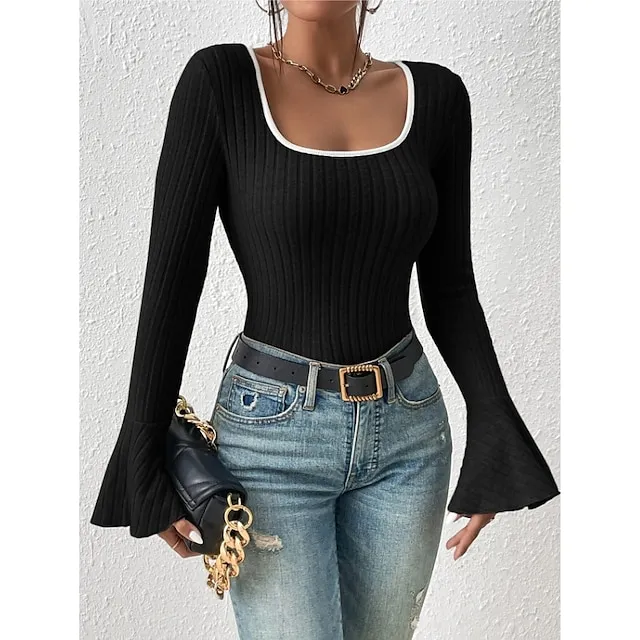 Women's USA Work Lantern Sleeve Black Red Blue Drawstring Long Sleeve Print Boat Neck Form Fit Fleece lined Spring & Summer