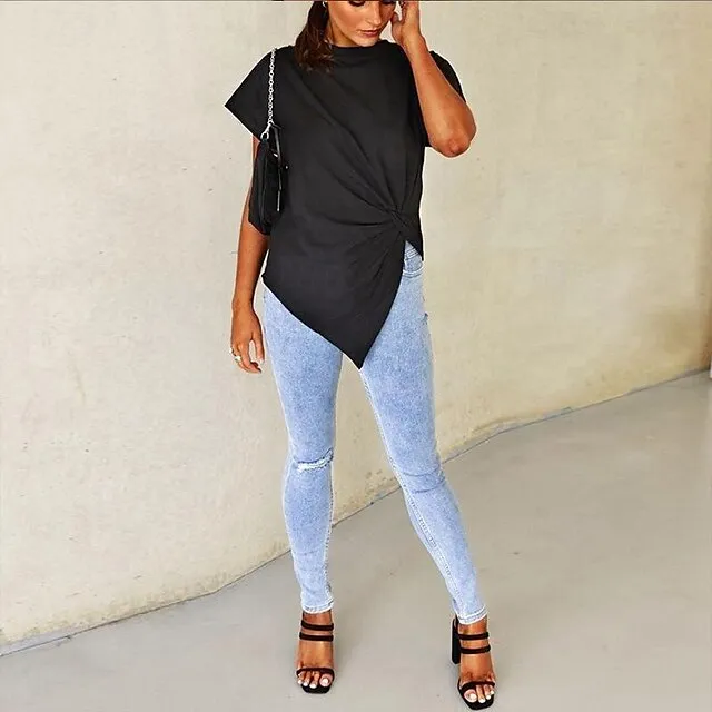 T shirt Tee Women’s Black White Wine Plain Ruched Asymetric Hem Street Daily Fashion Round Neck Regular Fit S