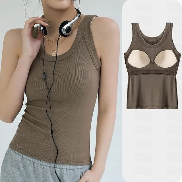 Tank Women’s Black White Khaki Solid Color Removable Pad Street Daily Fashion Round Neck M