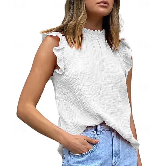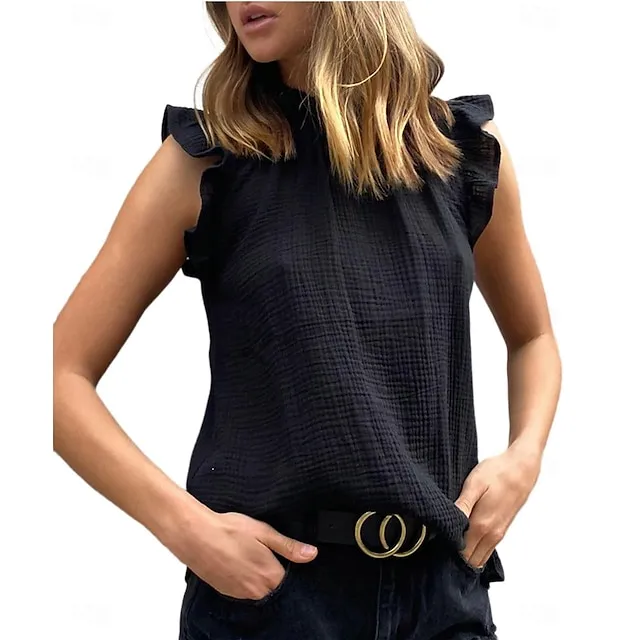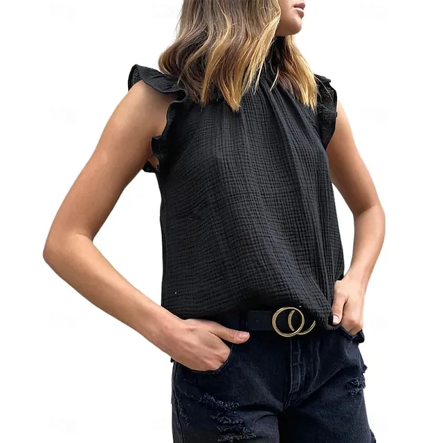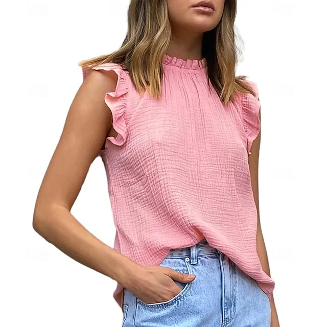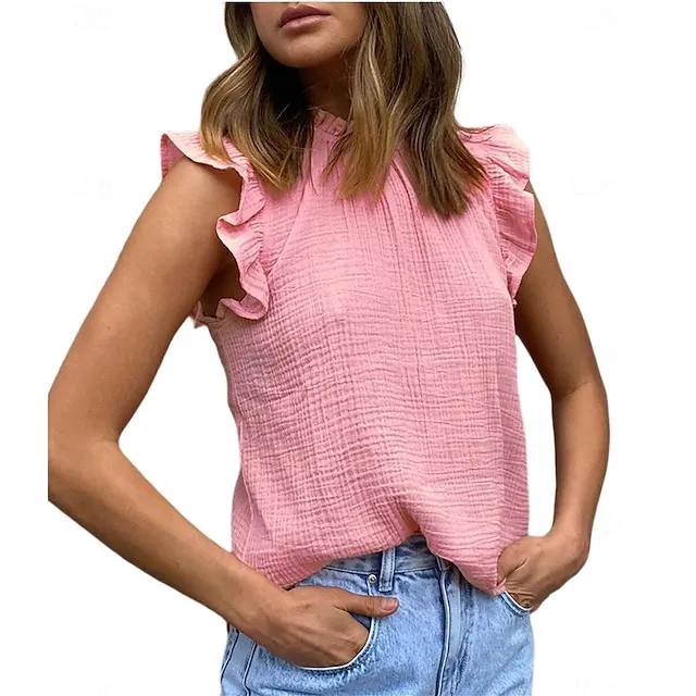 Tank Women’s Black White Pink Solid Color Ruffle Street Daily Fashion Round Neck S