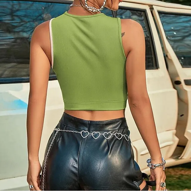 Tank Women’s Green Color Block Cut Out Cropped Street Daily Fashion Round Neck Regular Fit S