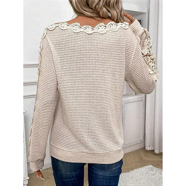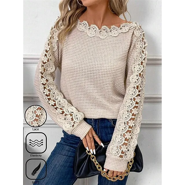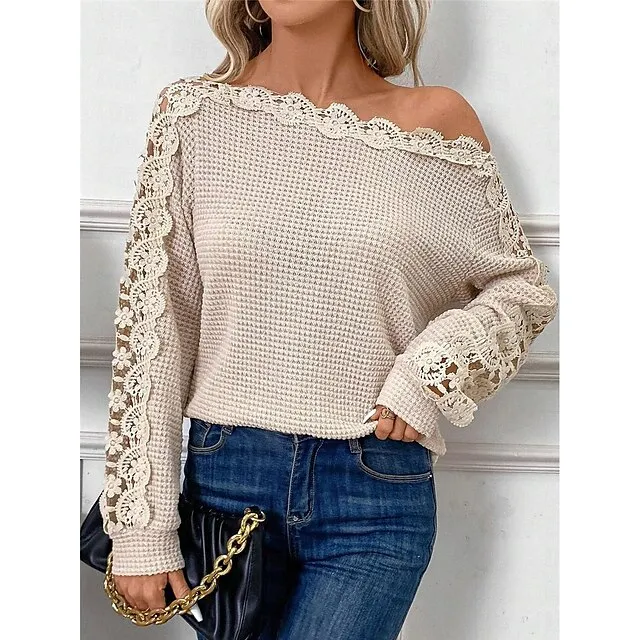 Women’s Lace Shirt Shirt Blouse Eyelet top Waffle Plain Casual Khaki Lace Long Sleeve Fashion Modern Off Shoulder Regular Fit Summer Spring