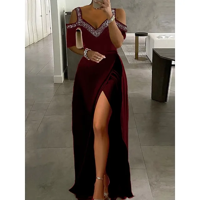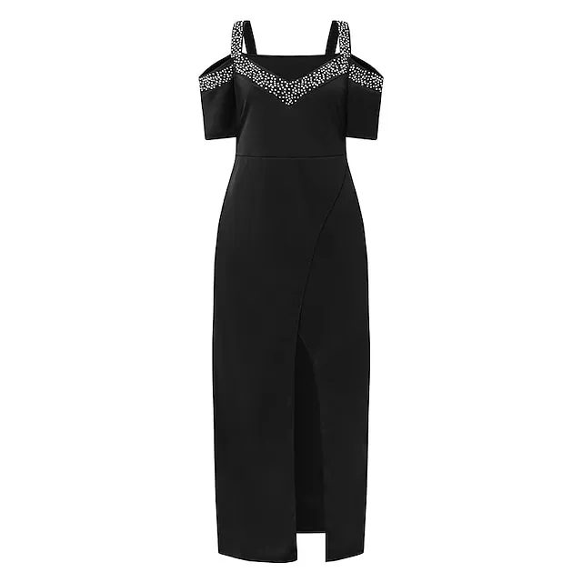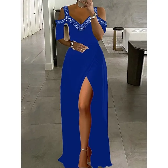 Women‘s Party Black Dress Formal Evening Graduation Long Maxi Dress Fashion V Neck Short Sleeve Patchwork Split Pure Color S M L XL 2XL