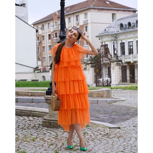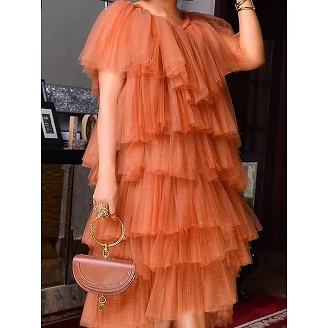 Women‘s Party Dress Wedding Guest Cocktail Dress Semi Formal Dress Midi Dress Orange Short Sleeve Pure Color Mesh Summer Spring Crew Neck Party Summer Dress Loose Fit S M L XL 2XL 3XL