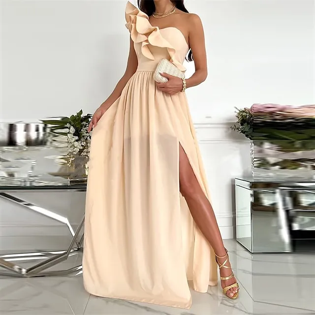 Women‘s Party Dress Wedding Guest Dress Swing Dress Long Dress Maxi Dress Green Black Wine Sleeveless Pure Color Ruffle Spring Summer One Shoulder Party Slim S M L XL XXL