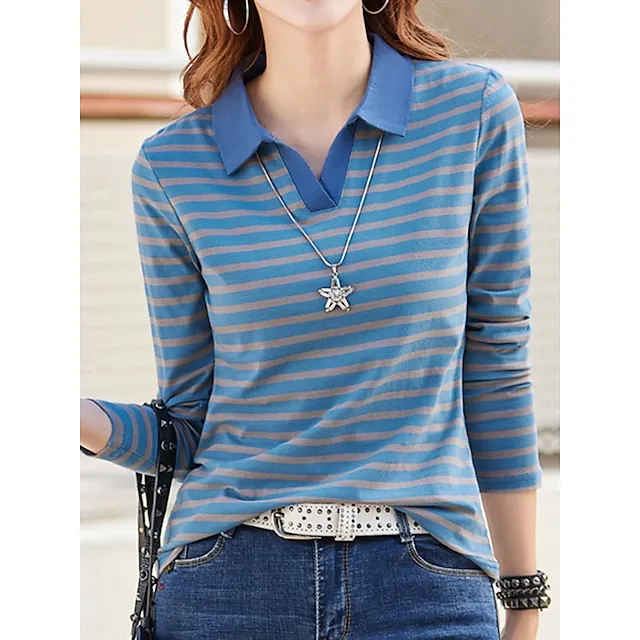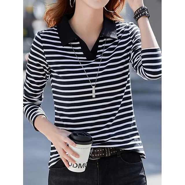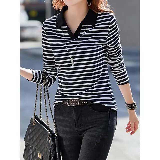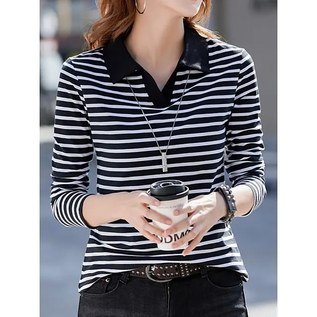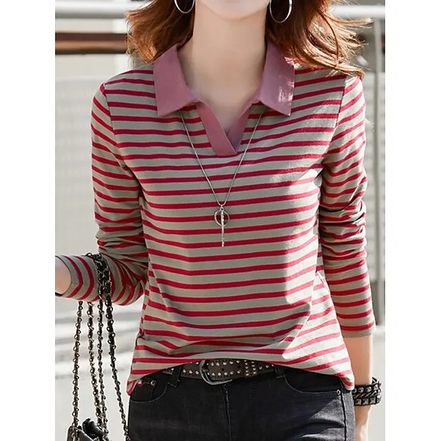 Women’s Polo T shirt Tee Cotton Striped Daily Weekend Black Red Blue Print Long Sleeve Fashion Shirt Collar Regular Fit Fall & Winter