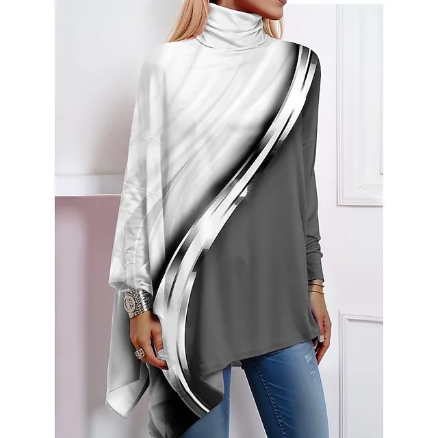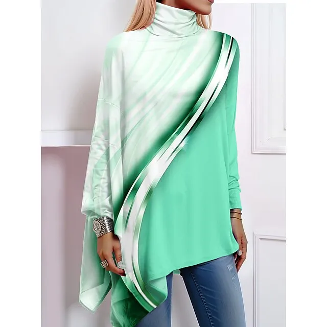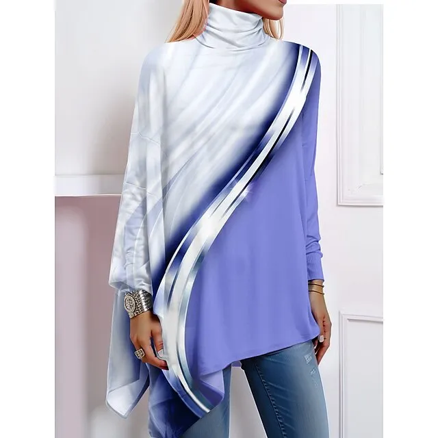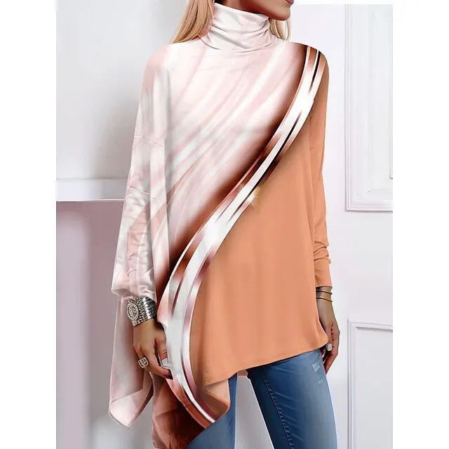 Women’s Shirt Blouse Color Block Casual Holiday Pink Blue Orange Print Asymmetric Hem Long Sleeve Fashion High Neck Regular Fit Spring & Fall