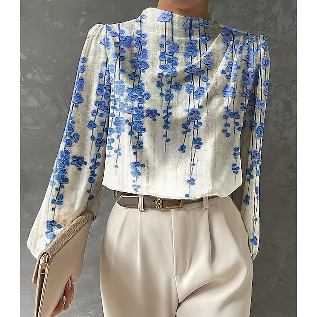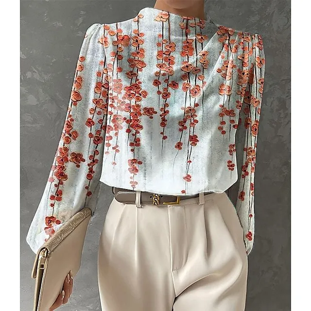 Women’s Shirt Blouse Floral Work Yellow Red Blue Print Long Sleeve Fashion Round Neck Regular Fit Spring & Fall