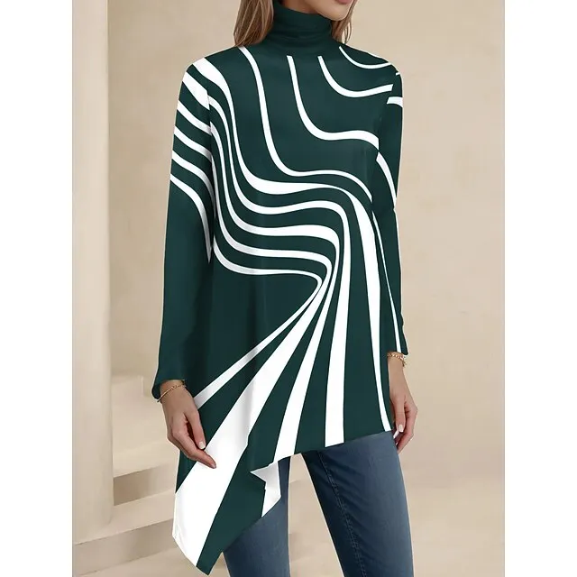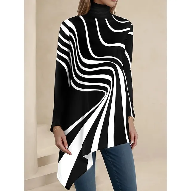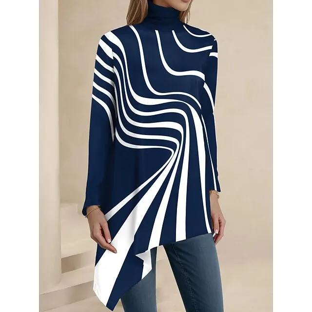 Women’s Shirt Blouse Graphic Casual Black Red Blue Print Asymmetric Hem Long Sleeve Fashion High Neck Regular Fit Spring & Fall