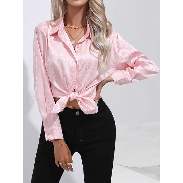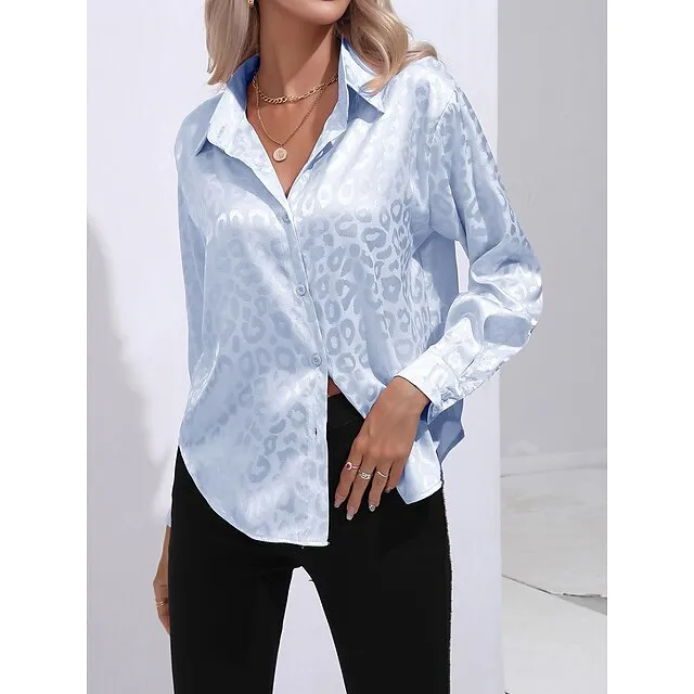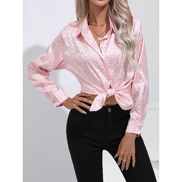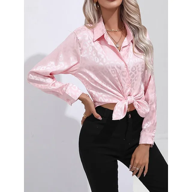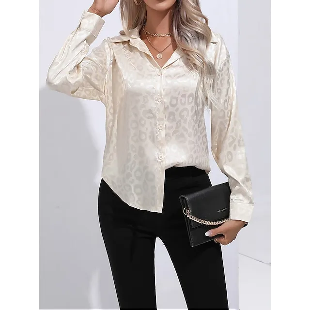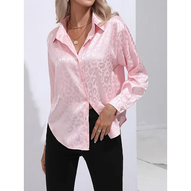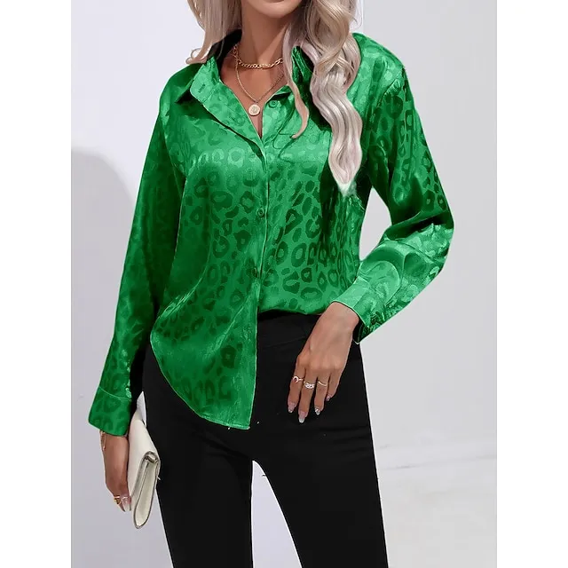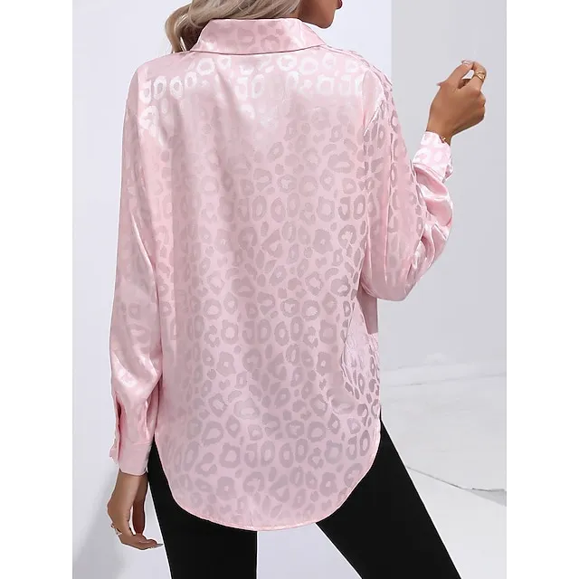 Women’s Shirt Blouse Satin Leopard Casual Pink Green Beige Print Button Long Sleeve Fashion Shirt Collar Regular Fit Spring & Fall