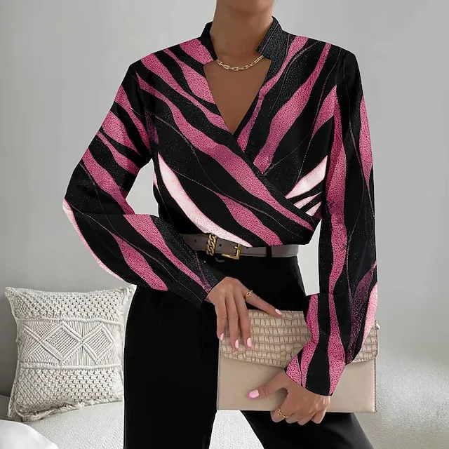 Women’s Shirt Blouse Striped Work Yellow Pink Blue Print Long Sleeve Fashion V Neck Regular Fit Spring & Fall