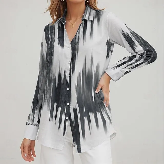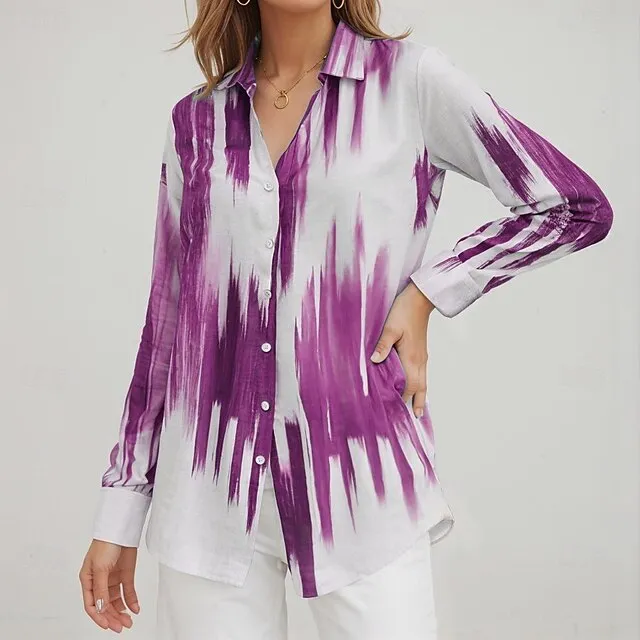 Women’s Shirt Blouse Tie Dye Casual Black Red Blue Button Print Long Sleeve Fashion V Neck Regular Fit Spring & Fall