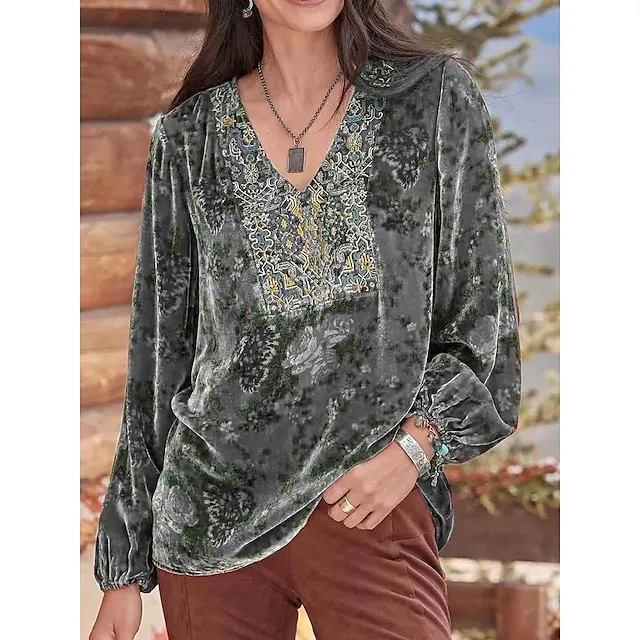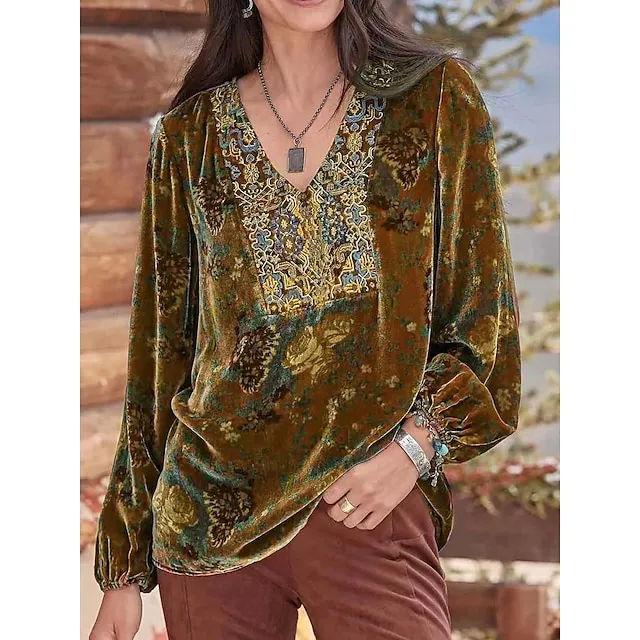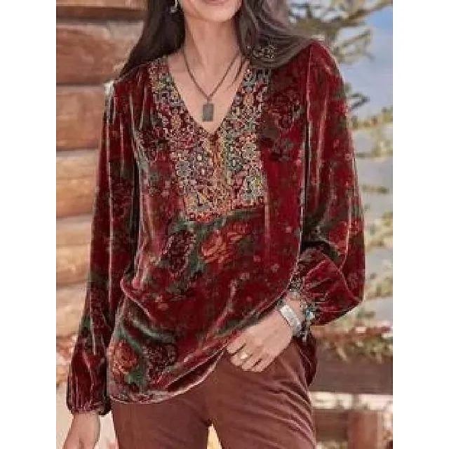 Women’s Shirt Blouse Velvet Floral Party Christmas New Year Yellow Red Purple Print Long Sleeve Basic V Neck Regular Fit Spring Fall