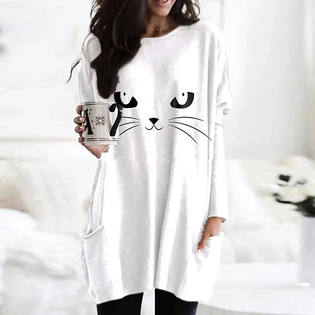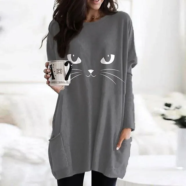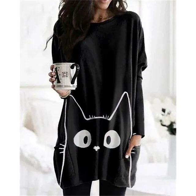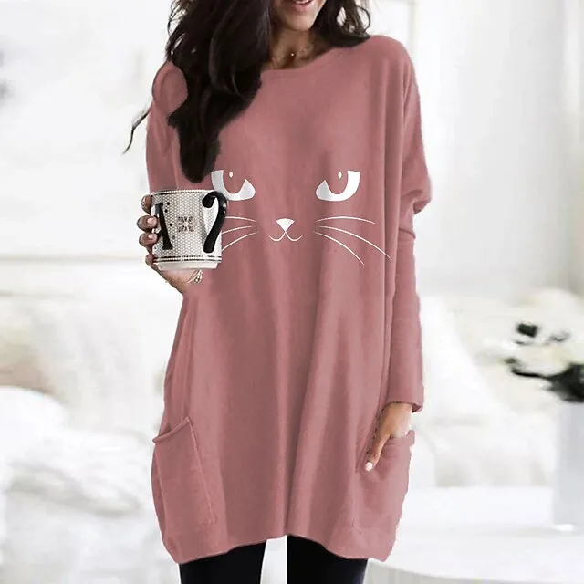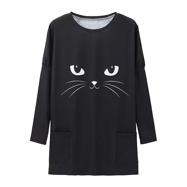 Women’s T shirt Tee Cat Daily Weekend Black White Pink Pocket Print Long Sleeve Funny Round Neck Regular Fit Fall & Winter