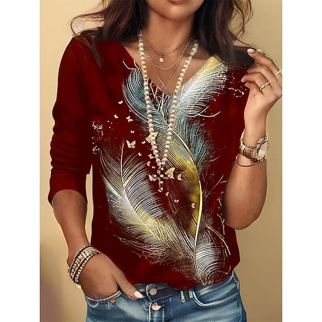 Women’s T shirt Tee Feather Daily Weekend White Wine Brown Print Long Sleeve Fashion V Neck Regular Fit Spring & Fall
