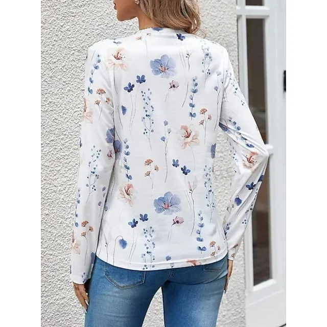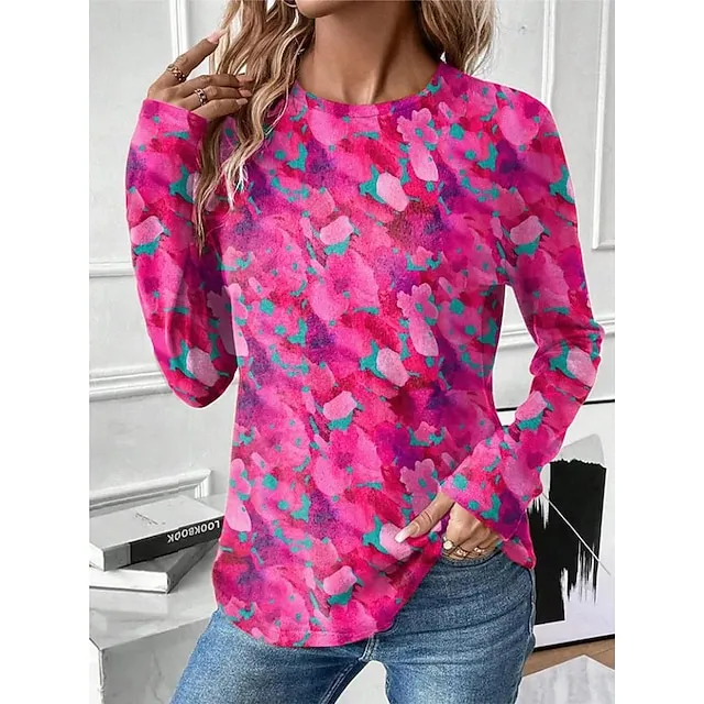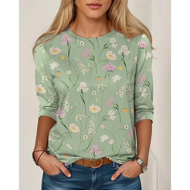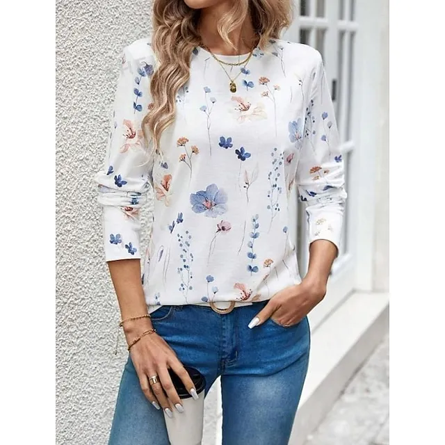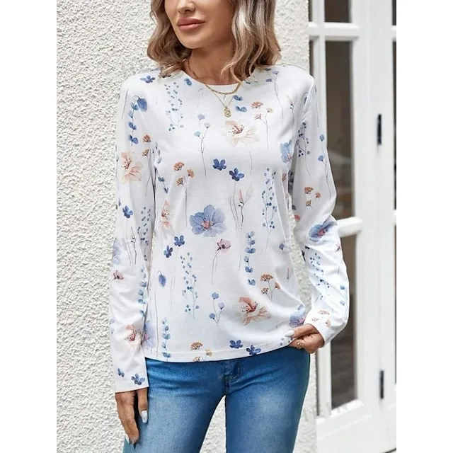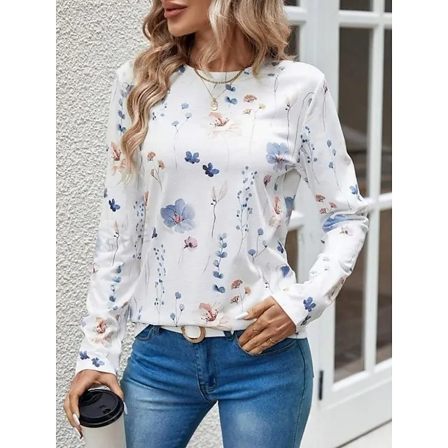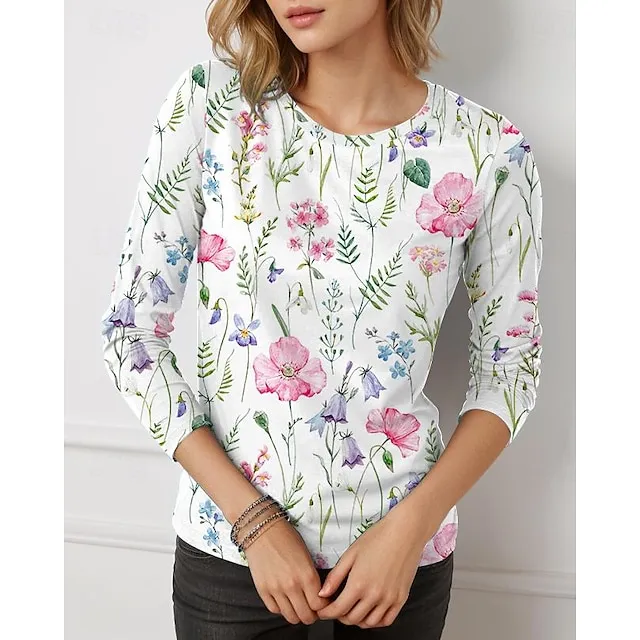 Women’s T shirt Tee Floral Daily Weekend White Pink Green Print Long Sleeve Fashion Crew Neck Regular Fit Spring