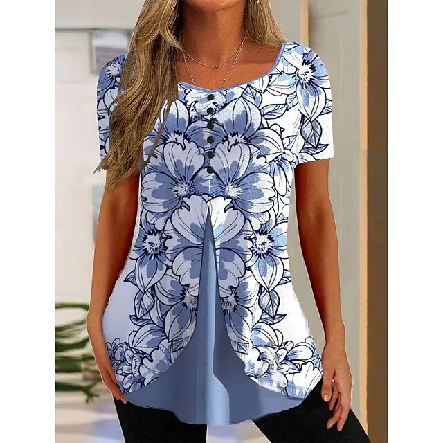 Women’s T shirt Tee Floral Holiday Weekend Pink Navy Blue Blue Print Button Short Sleeve Basic Round Neck Regular Fit