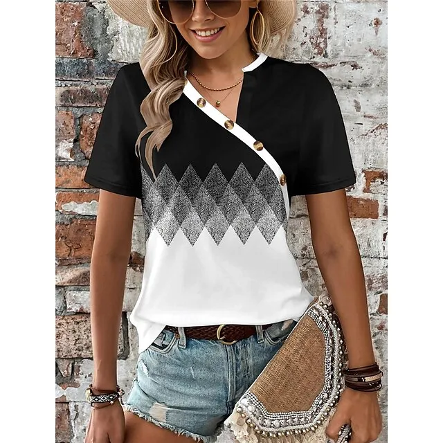 Women’s T shirt Tee Geometric Daily Weekend White Pink Blue Button Print Short Sleeve Fashion Diagonal Neck Regular Fit Summer