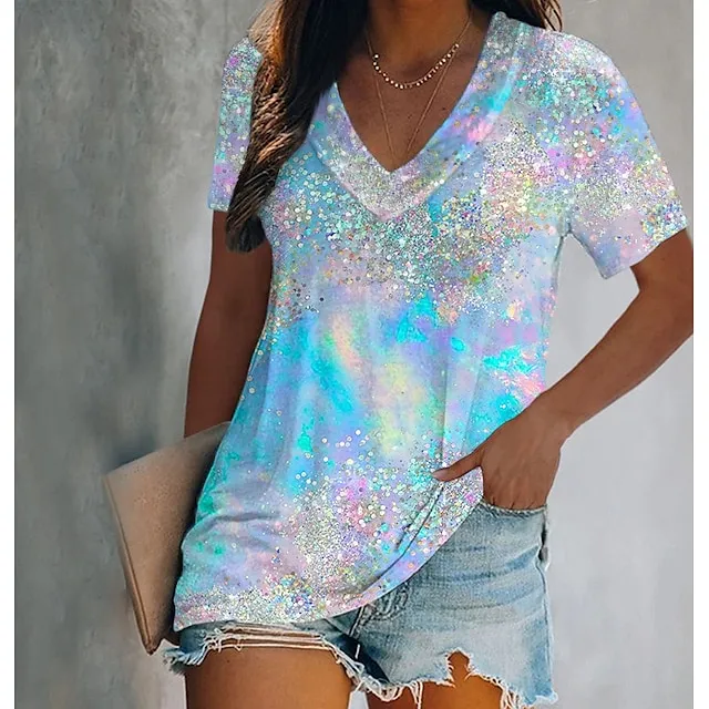 Women’s T shirt Tee Graphic Butterfly Daily Weekend Yellow Blue Purple Print Short Sleeve Basic V Neck Regular Fit