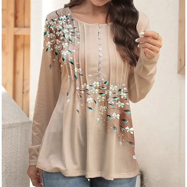 Women’s T shirt Tee Henley Shirt Designer Shirt Floral Casual Holiday Pink Blue Orange Print Button Long Sleeve Fashion Round Neck Regular Fit Spring & Fall