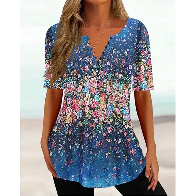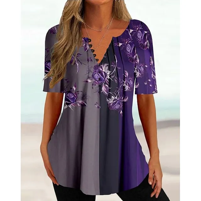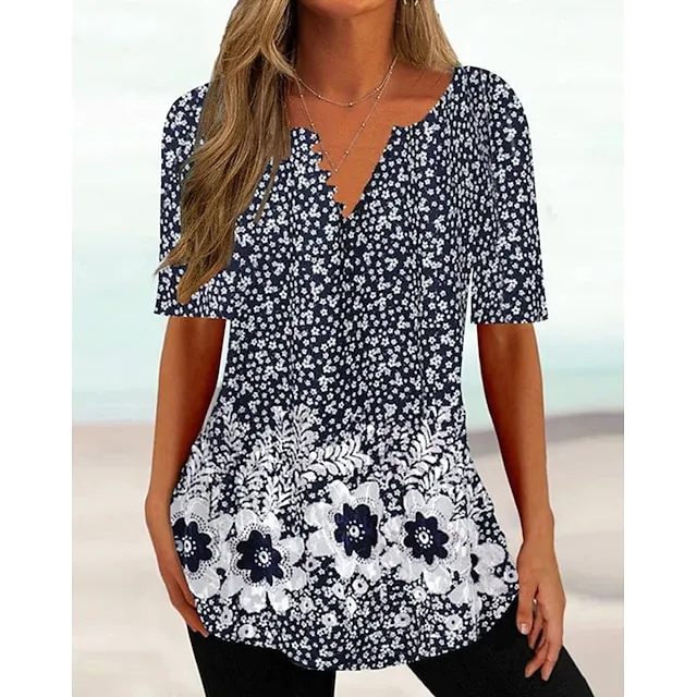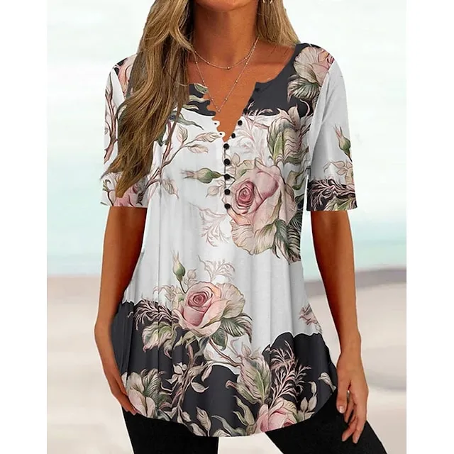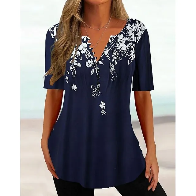 Women’s T shirt Tee Henley Shirt Floral Holiday Weekend Black White Navy Blue Button Print Short Sleeve Tunic Basic Round Neck Regular Fit