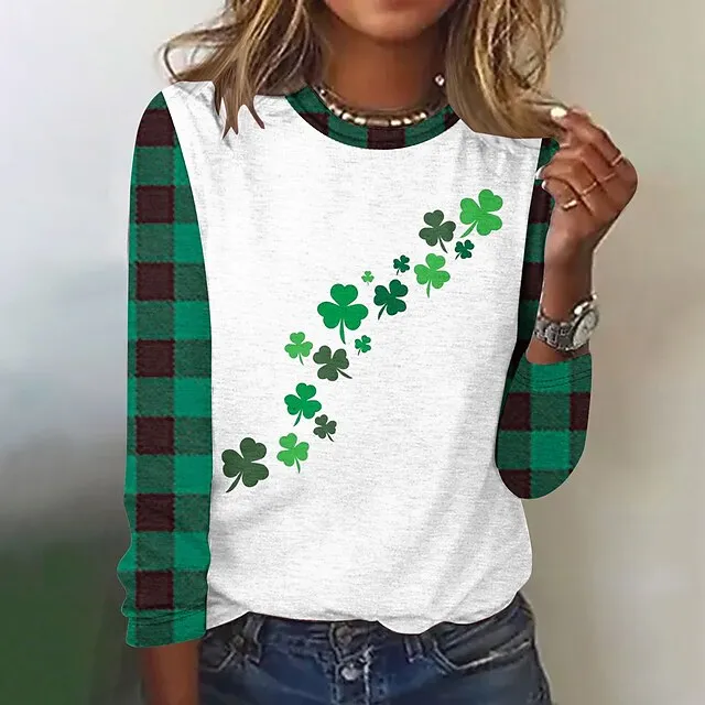Women’s T shirt Tee Shamrock Holiday Grass Green Light Green Army Green Print Long Sleeve Fashion Round Neck Regular Fit Spring & Fall