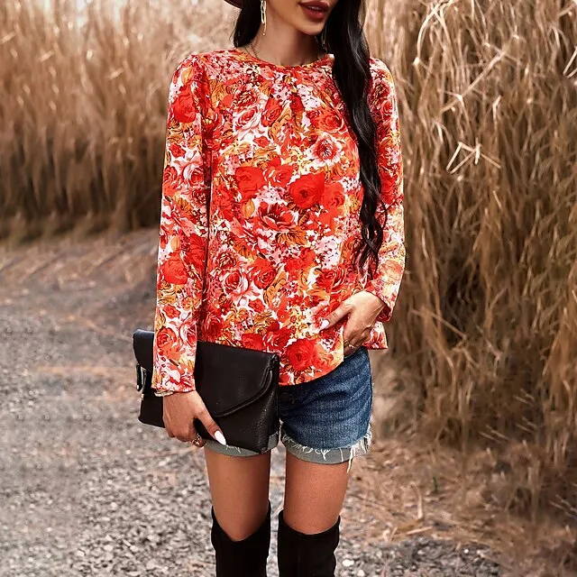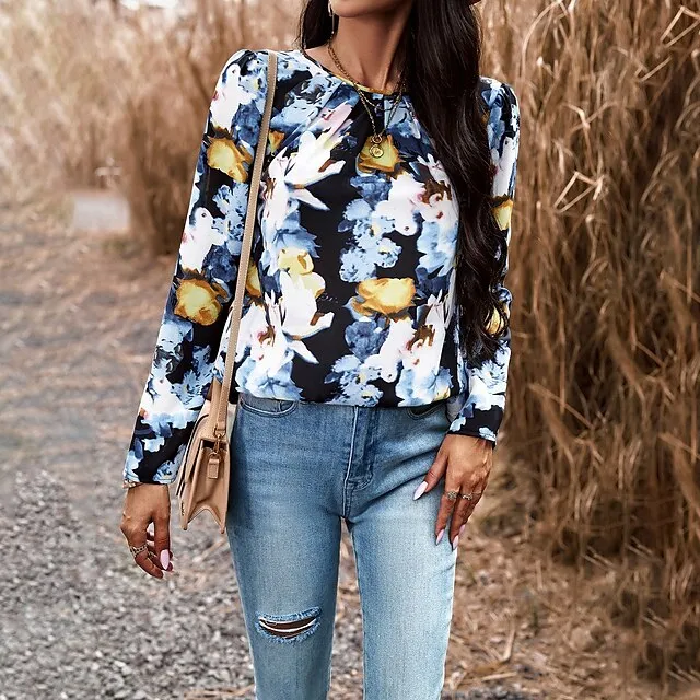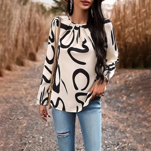 Women’s USA Work Lantern Sleeve Black Red Blue Drawstring Long Sleeve Print Boat Neck Form Fit Fleece lined Spring & Summer