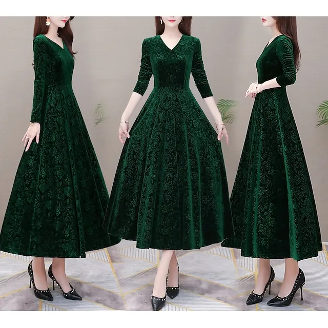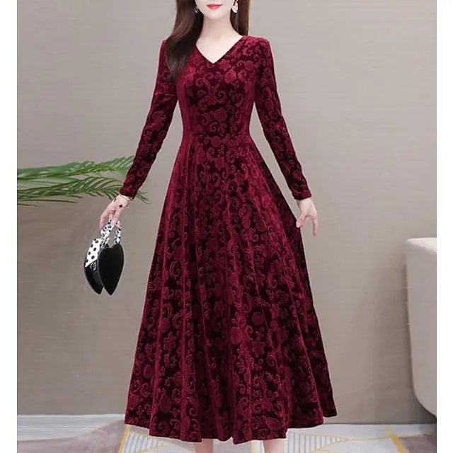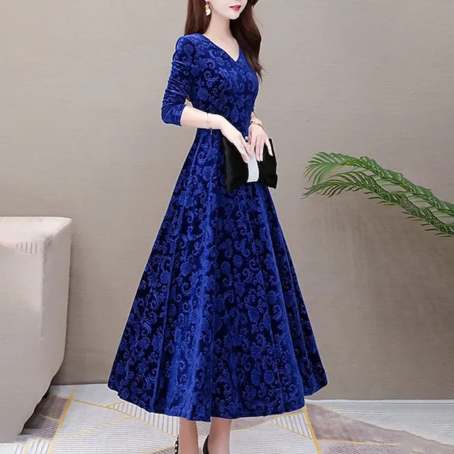 Women’s Velvet Dress Homecoming Dress Empire Waist Dresses Long Dress Maxi Dress Black Wine Blue Long Sleeve Pure Color Ruched Spring Fall Winter V Neck Stylish Winter Dress Evening Party Wedding
