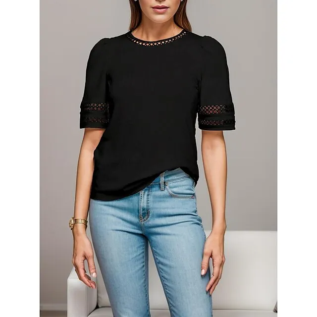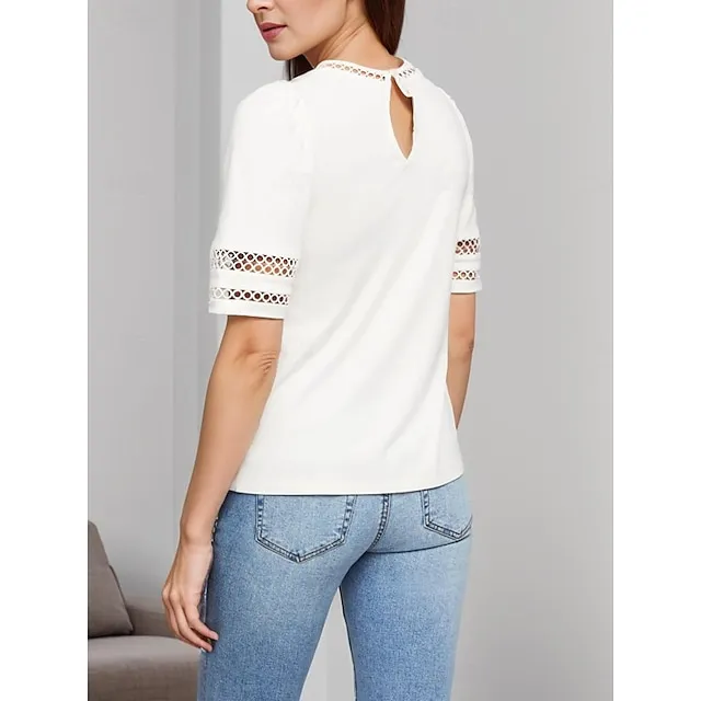 Women’s White Lace Tops Plain Eyelet Hollow Casual Round Neck T-Shirts Fashion Puff Sleeve Modern Regular Fit Summer